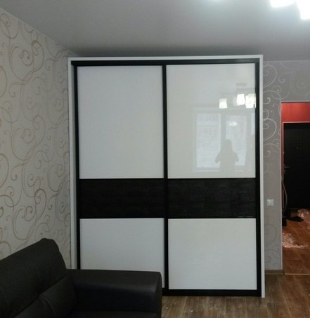 Шкаф функциональный и компактный. Стильный вид, современный дизайн. Фасады выполнены в белом цвете, декорированы черными прямыми вставками. Он линейной формы. В длину он 1,5 метра. Изготовлен из пластика и дополнен лакобелем.
