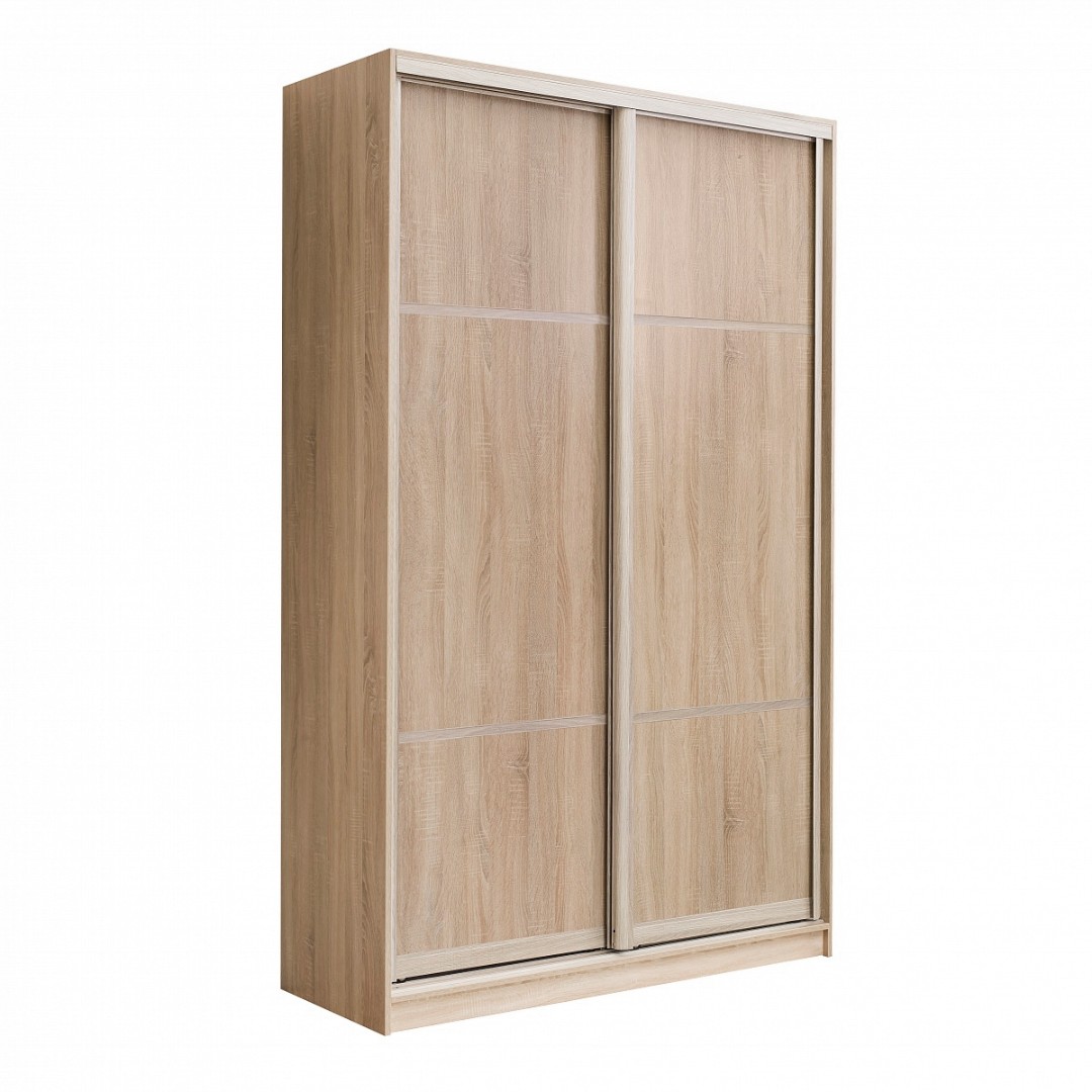 Шкаф-купе общего назначения для спальни, гостиной или прихожей. Отдельно стоящая конструкция имеет ширину 163 см и высоту 240 см. Уникальность шкафа заключается в том, что дверной профиль облицован декоративной пленкой древесного цвета в тон фасада и корпуса. Шкаф имеет глухие раздвижные двери из ЛДСП с видимой натуральной древесной текстурой.