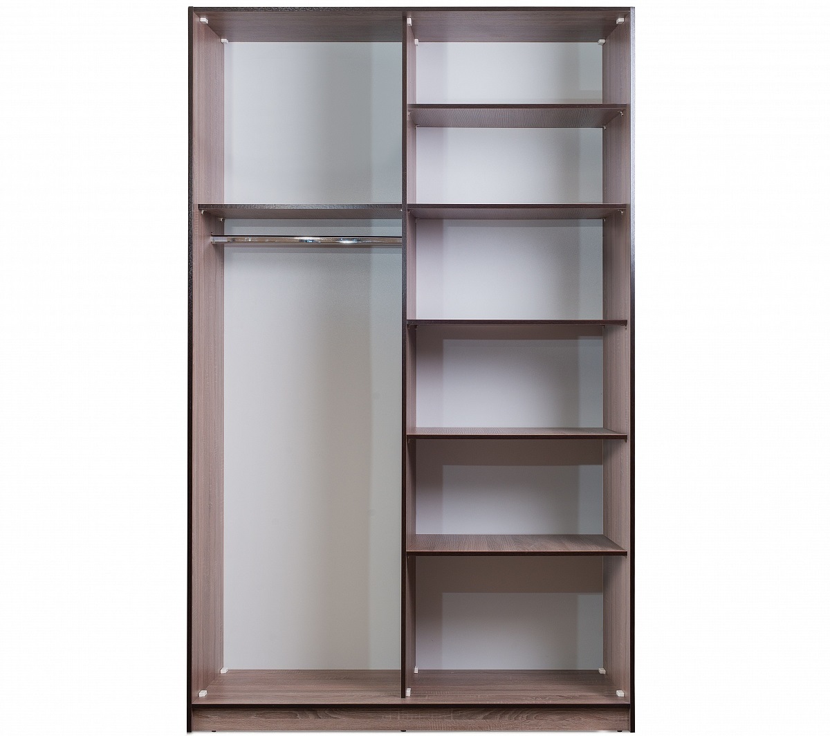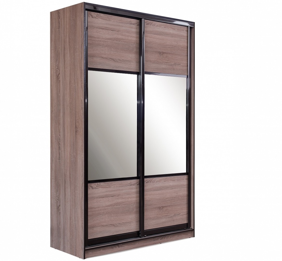 Шкаф-купе из ЛДСП с зеркалами имеет металлический профиль темно-коричневого цвета с глянцевым покрытием, такая расцветка профиля хорошо сочетается с древесным фасадом изделия и придает шкафу оригинальный и стильный вид. Внутри двухстворчатый шкаф-купе «разбит» на 2 функциональные зоны для хранения вещей. Данная модель шкафа хорошо подойдет для спальни или для узкой прихожей в стиле Лофт.