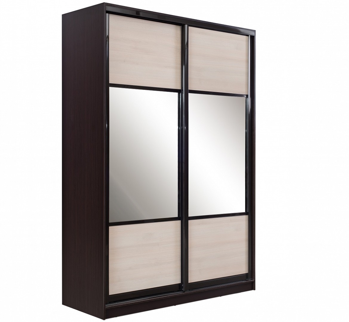 Шкаф-купе двухдверный для небольшой квартиры. Дверцы с зеркалами не крадут свободное место в комнате и зрительно расширяют пространство. Конструкция изготовлена из ЛСДП в двух контрастных цветах – дуб венге темный и дуб шамони светлый. Внутри шкафа располагаются полки и штанга.