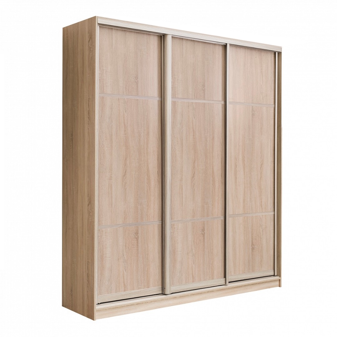Трехсекционный шкаф с раздвижными дверями «купе» изготовлен из ламинированной ДСП в цвете светло-бежевого дуба сономы с серым оттенком. Особенность шкафа заключается в том, что корпус, фасад и профиль изделия гармонично сочетаются друг с другом и создают целостную композицию, поскольку выполнены в схожих расцветках. Три глухие створки шкафа украшены продольными вставками-разделителями. Шкаф-купе шириной 1,8 метров хорошо подойдет для светлой спальни или гостиной.