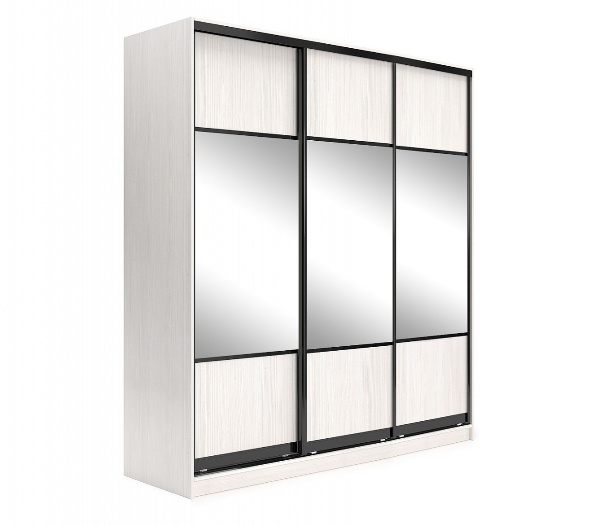 Шкаф-купе с тремя створками. Каждая раздвижная створка имеет зеркало по центру фасада. Внутри шкафа располагаются вместительные полки и две металлические штанги. Данная модель шкафа очень удобна для большой семьи: в такой шкаф-купе поместится большое количество вещей, обуви, одежды и многое другое.