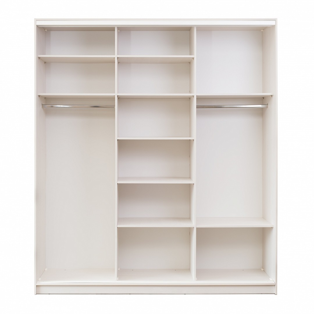 Светлый 3-хстворчатый шкаф-купе белого цвета с темным обрамлением и зеркалом на каждой створке сделает любую спальню не только уютной, но и стильной. Помимо дизайна модель хороша своим наполнением: шкаф имеет множество полок, установленных на разной высоте, а также две отделения с металлическими штангами для размещения верхней одежды.