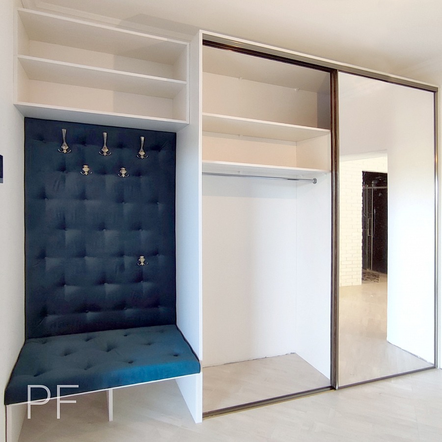 код 136463Комбинация из закрытой зоны шкафа-купе, полок, места для сидения и открытых вешалок.