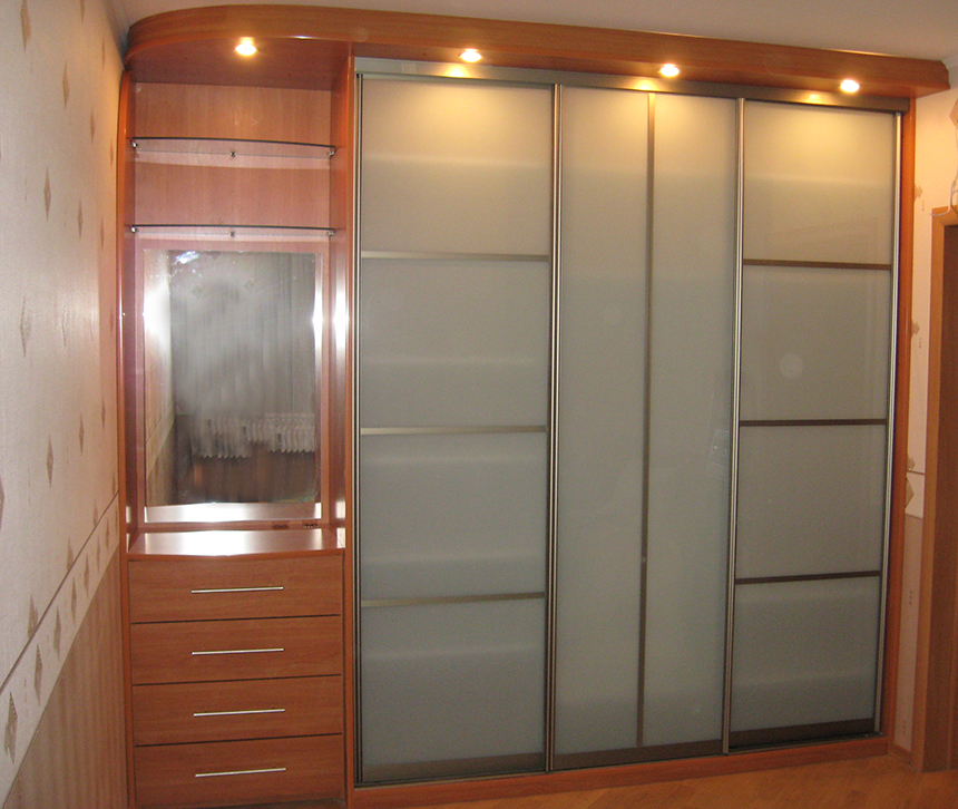 Линейный шкаф-купе оснащен вместительной тумбой с выдвижными ящиками и открытыми стеклянными полками, на которые легко разместить мелкие вещи и головные уборы. Три раздвижные створки выполнены из ударопрочного стекла белого матового цвета, декорированного бронзовыми направляющими из алюминия. В комплекте также имеется яркая подсветка, встроенная в карниз.