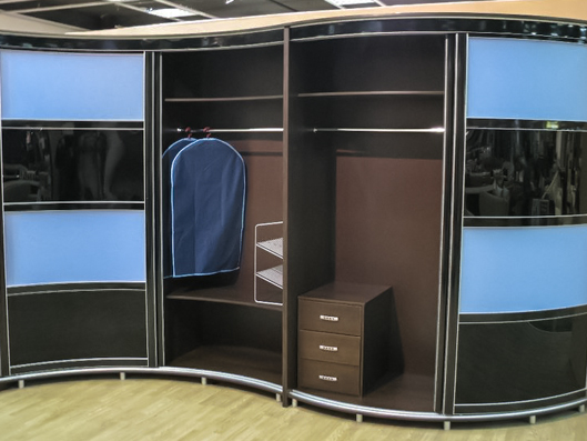 Четыре раздвижные створки шкафа-купе изготавливаются из высококачественного и прочного лакобеля в комбинированном цвете: голубой матовый и глянцевый черный. Данное сочетание делает радиусный шкаф достаточно темным, однако красивая глянцевая поверхность позволит не только сделать помещение визуально шире, но привнести немного света. Шкаф-купе для прихожей или гостиной также оснащен функциональным и очень удобным внутренним наполнением с открытыми полками, хромированными штангами для плечиков и тумбой с выдвижными ящиками.