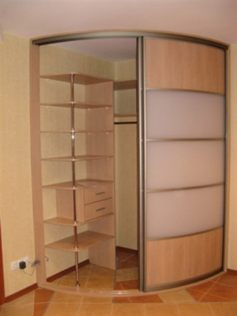 Наполнитель шкафа-купе позволяет назвать модель полноценной гардеробной. Шкаф занимает площадь в четверть круга и устанавливает в углу помещения. Соединив полукругом две смежные стены, поможет создать аккуратную приятную глазу форму. Створки шкафа выполнены из ЛДСП и декорированы вставками из пластика белого цвета.