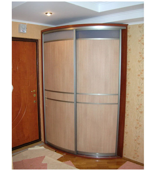 Двустворчатый шкаф-купе не требует большой площади для размещения, благодаря своим компактным размерам. Он выполнен в виде радиусной конструкции. Модель отличается продуманным внутренним наполнением, что позволяет вмещать множество вещей.