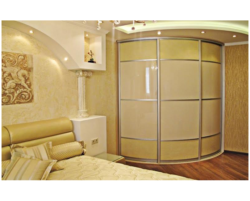 Трехстворчатая модель радиусного шкафа-купе станет приятным дополнением для любой комнаты в вашем дома. Конструкция очень вместительная, но при этом не займет много места. Фасад выполнен в приятном бежевом цвете в двух оттенках и дополнен алюминиевыми рейками.