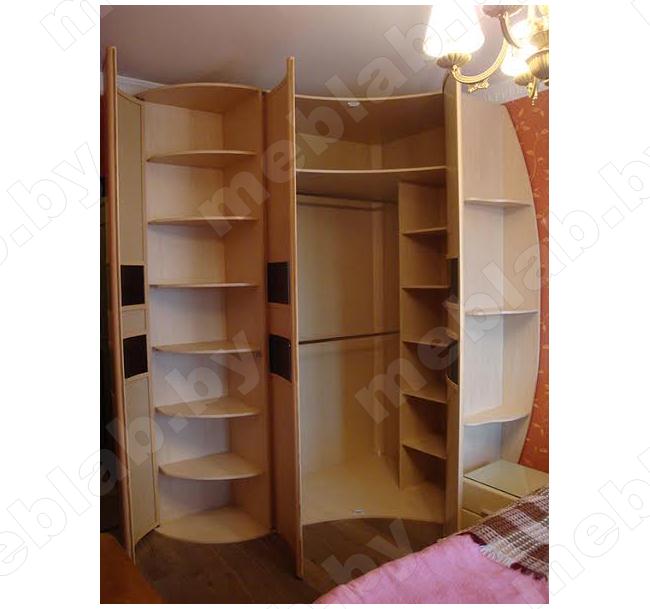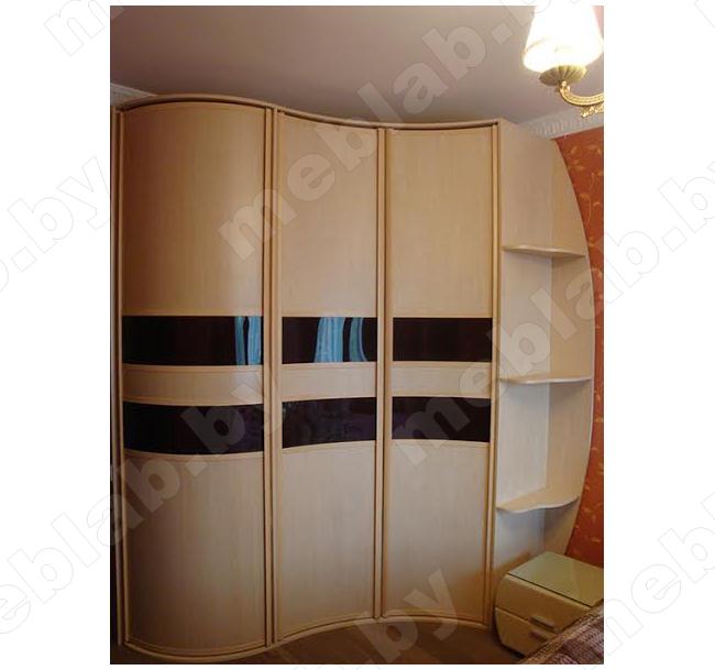 Современный шкаф-купе имеет радиусную конструкцию, которая прекрасно подойдет для небольших помещений. Фасад в основном выполнен в светло-коричневом цвете с древесной текстурой, но также дополнен черными глянцевыми вставками. Также приятным дополнением является наличие нескольких открытых полок.
