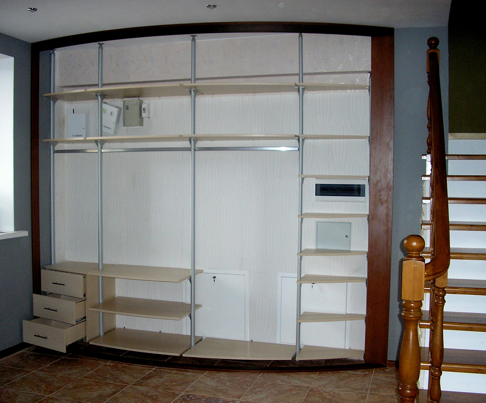 Практичный шкаф-купе радиусный с системой колонн обладает мощным и прочным каркасом, который придаетмодели дополнительную устойчивость. Шкаф габаритный, вместительный, с массой полок различных форм и размеров.