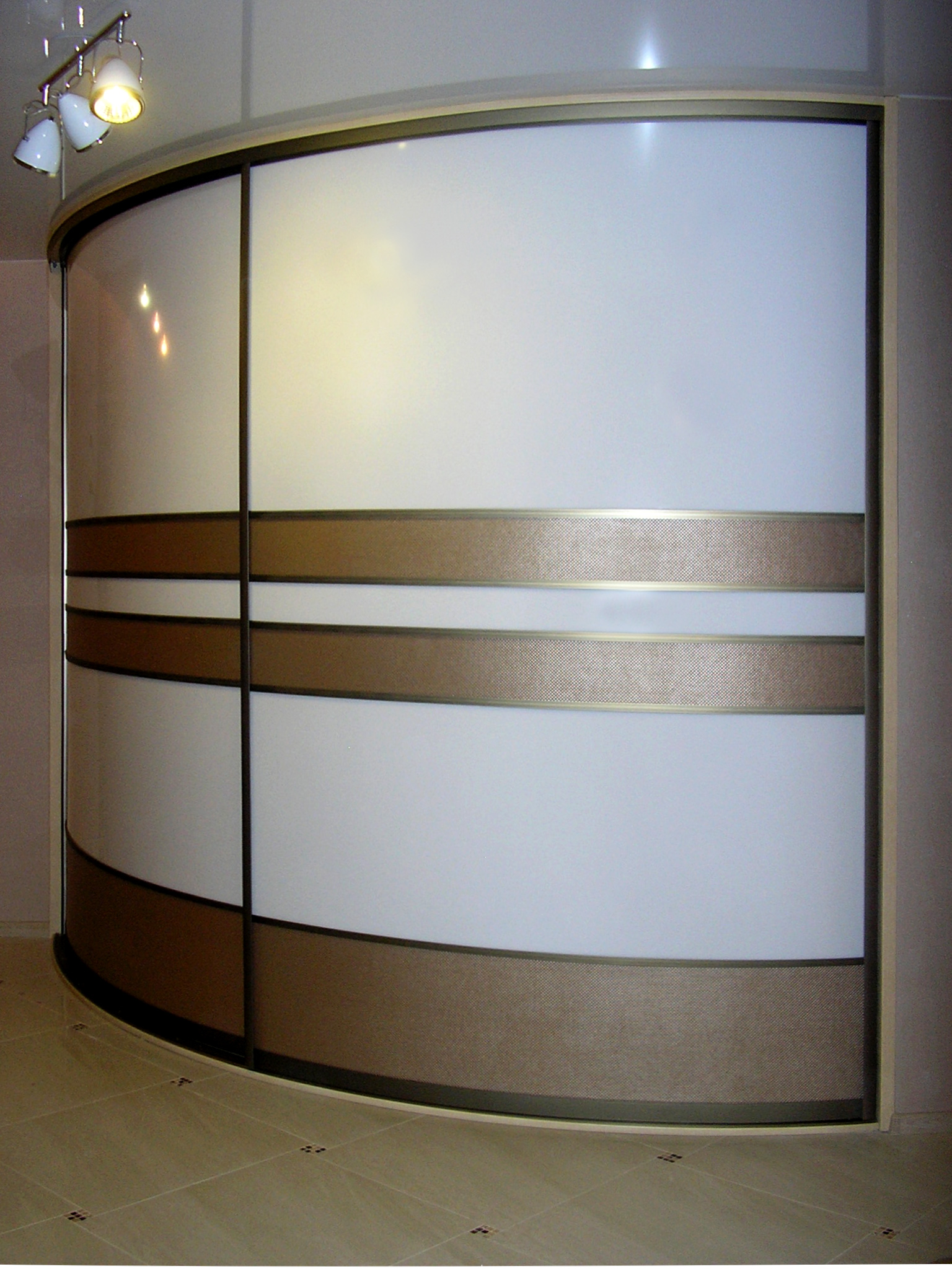 Надежный шкаф-купе оснащен вместительным светлым комодом. Выдвижные шуфляды оснащены небольшими металлическими ручками-скобами, которые помогу с легкостью выдвигать шуфляды. Характерной особенностью дизайна шкафа является закругление углов на полочках и комоде.