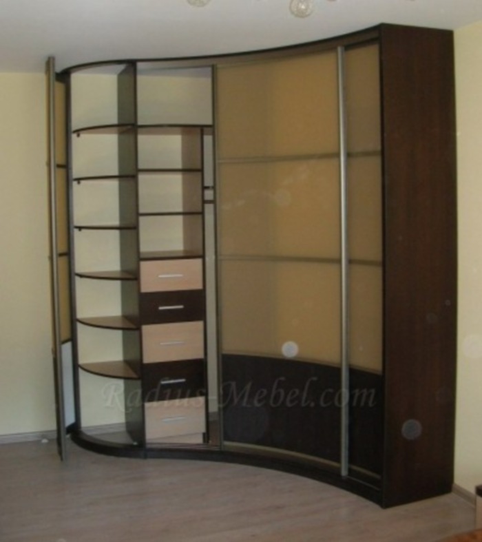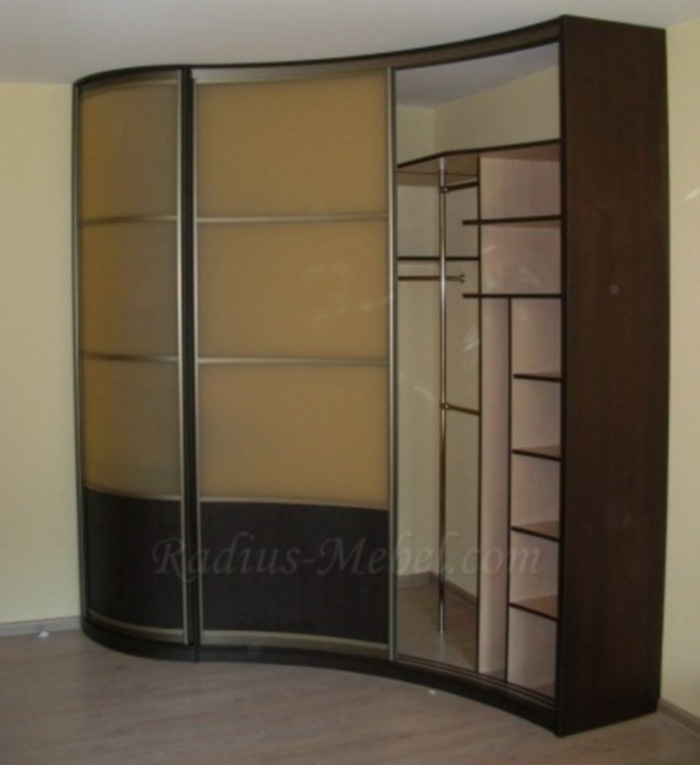 Шкаф-купе радиусный трехдверный выглядит важно и стильно. Низ шкафа отделан темным материалом, верх - матовым стеклом под цвет состарившейся книжной бумаги. Такой визуальный прием делает шкаф легче и более гармоничней.