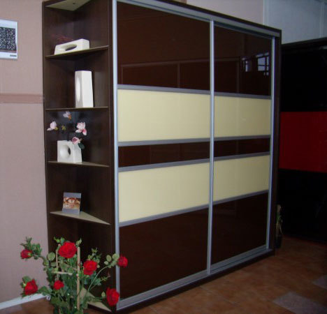 Шкаф-купе с необычным сочетанием лакобелевых вставок коричневого и бледно-желтого цвета. Модель оборудована угловыми открытыми полками. Благодаря спокойному сочетанию цветов, этот шкаф будет выглядеть уместно как в офисе, так и дома.