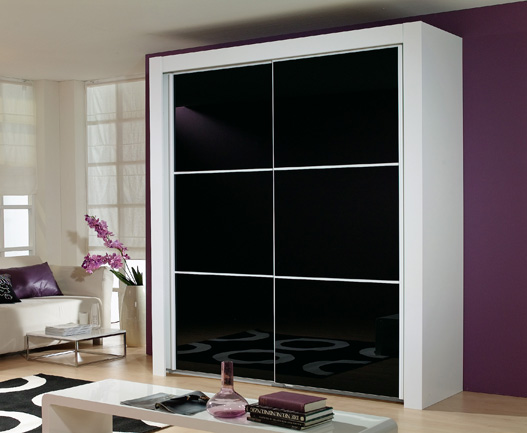 Данная модель линейного шкафа-купе представляет собой конструкцию из утолщенного каркаса и двух раздвижных дверей, наполненных лакобелем черного цвета. Последний является современным вариантом стекла, внутренняя поверхность которого покрывается краской. Такой вариант декора удобен для дизайнерских помещений, так как позволяет подобрать цвет дверей в соответствии с общим дизайном.