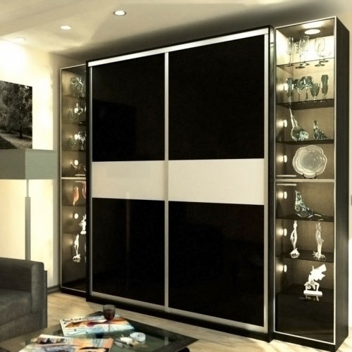 Черно-белое оформление прекрасно подойдет для оформления современного интерьера в стиле минимализм или модерн. Освещенные боковые модули идеально подойдут для хранения кубков и красивых аксессуаров, которые будут приятно радовать глаз. Внутреннее наполнение основной части шкафа-купе может быть выполнено совершенно любым по требованиям и желанием заказчика.