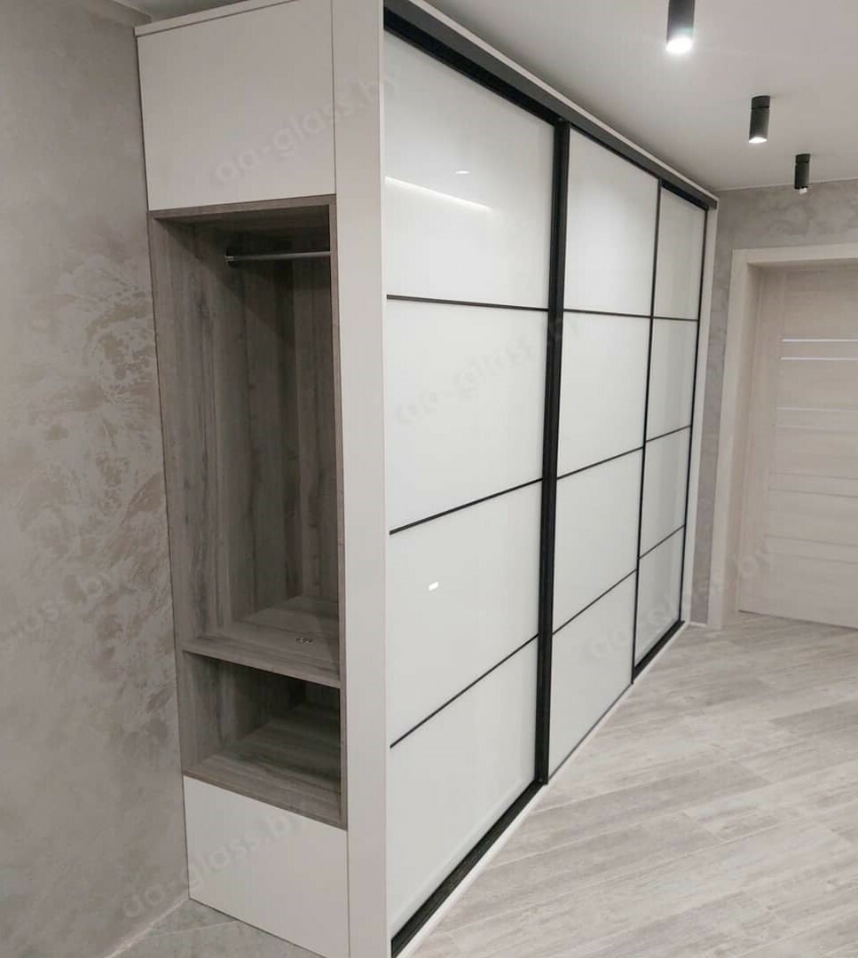Темный шкаф-купе с глухими фасадами, полки справа. Ширина 185 см.