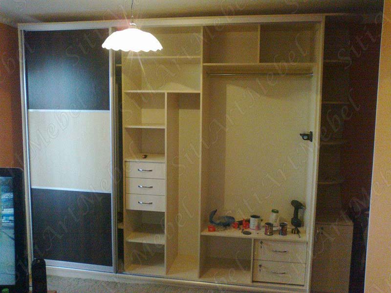 Шкаф-купе глубиной 60 см содержит штангу для вешалок, полки и выдвижные ящики внутри.