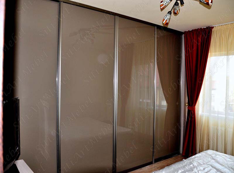 Стильный шкаф-купе имеет глянцевый фасад кофейного цвета. Раздвижные створки за счет качественной фурнитуры работают плавно и бесшумно. Представленная на фото модель сможет стать частью интерьера спальни или современной прихожей.
