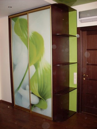 Высокий шкаф-купе представлен в виде стильной двустворчатой конструкции. Фасад модели, оформленный в золотистую рамку, украшает оригинальная фотопечать. Открытые полочки, имеющиеся с одной стороны шкафа, делают модель еще более функциональной и удобной в эксплуатации.