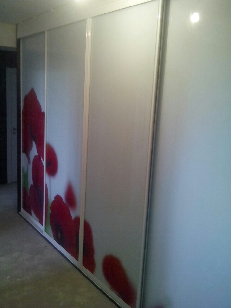 Широкий шкаф-купе глубиной 60 см и высотой более двух метров. Зеркало установлено на центральную створку.