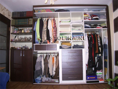 Внутри шкаф оборудован просторными выдвижными ящиками для белья, многочисленными полками и нишами для удобного хранения вещей, а также штангами для одежды.