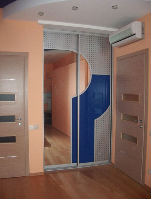 Небольшой шкаф-купе станет оптимальным вариантом в прихожую. Модель выполнена в сочетании синего и серебристого цветов, основная часть фасада изготовлена из зеркального материала. Две раздвижные створки двигаются бесшумно и легко.