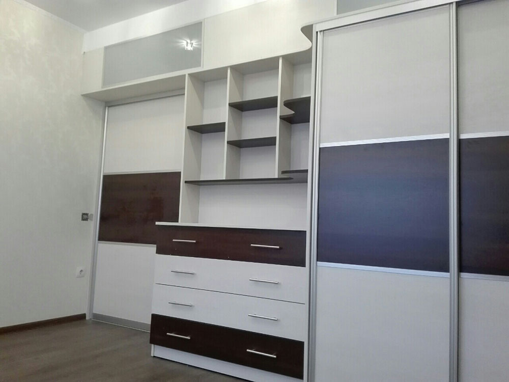 Данная модель шкафа-купе совмещена с неглубоким комодом и секцией с открытыми полками. Представленная конструкция обладает большим функционалом, чем обычный шкаф-купе и благодаря необычной компоновке стильным дизайном. Модель выполнена в сочетании белого цвета и цвета каштана.