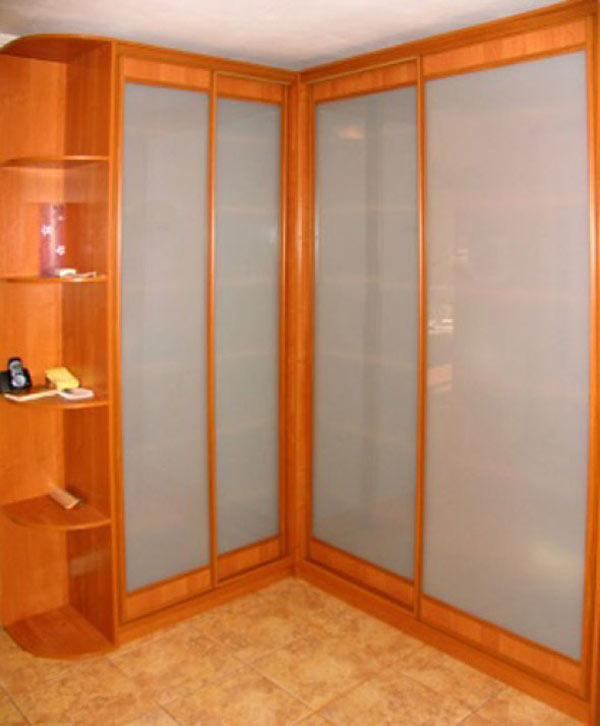 Широкогабаритный угловой шкаф-купе станет незаменимым атрибутом в любом доме. Раздвижные створки окрашены в матовый цвет. Угловые полки станут отличным местом для размещения декоративных предметов.