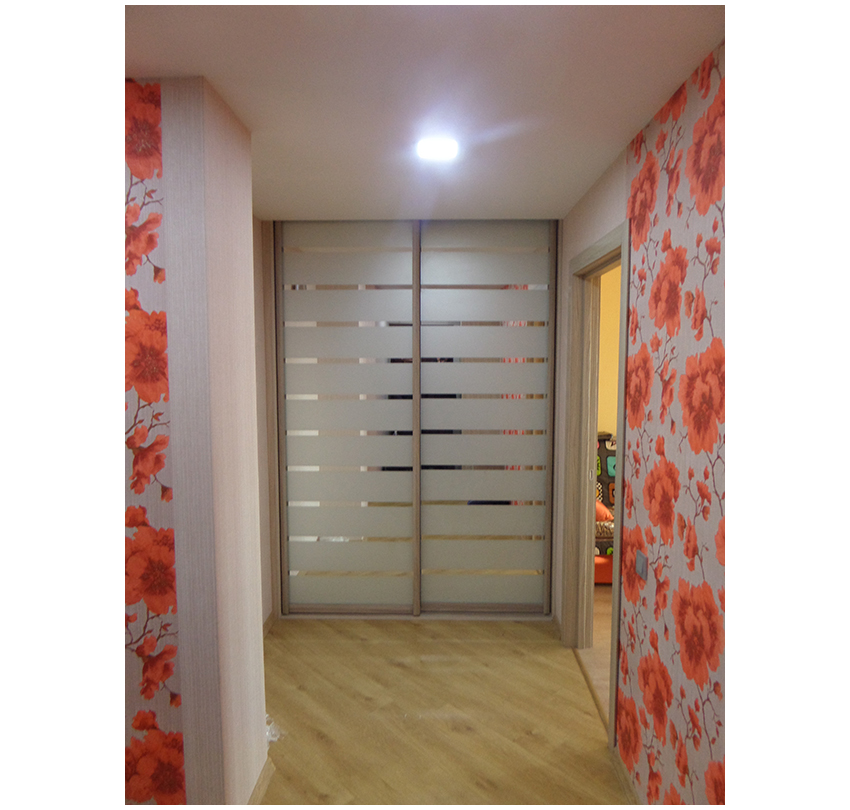 Компактный встроенный будет отлично смотреться в небольшой спальне или светлой прихожей. Раздвижные створки модели работают бесшумно за счет современной системы. Фасад шкафа украшаю пескоструйные элементы, приносящие во внешний вид конструкции оригинальную нотку.