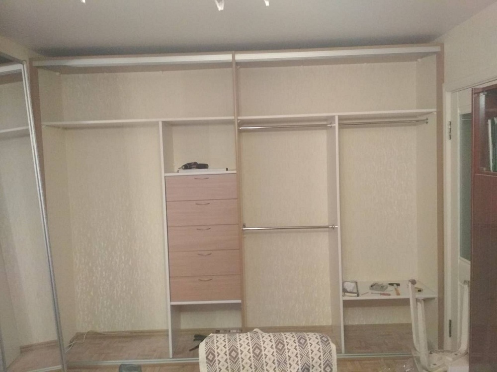Очень просторная и вместительная модель шкафа-купе имеет встроенную линейную конструкцию, позволяющую использовать все полезное пространство, а также сэкономить семейный бюджет за счет использования меньшего количества строительных материалов. Изготавливается шкаф-купе из белого ДСП, который является высококачественным, прочным и экологически чистым продуктом. Внутреннее наполнение выполнено на заказ и имеет различные открытые полки, выдвижные ящики и штанги для плечиков.