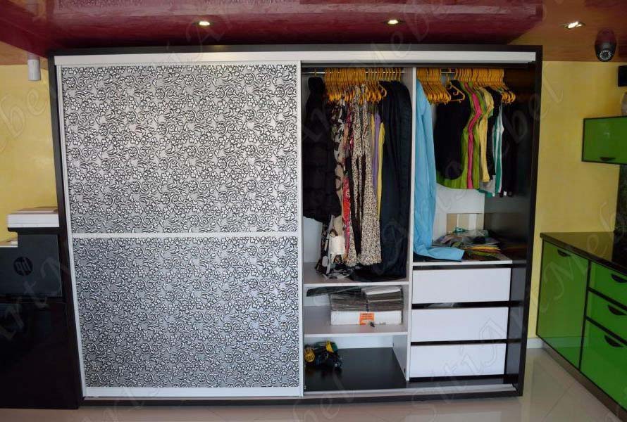 Просторный шкаф-купе станет прекрасным дополнением в интерьере вашей спальни. Шкаф представляет собой двустворчатую конструкцию со стандартным наполнением, необходимым для комфортного хранения одежды. Но главной особенностью модели являются серебристые узоры на зеркальном фасаде.