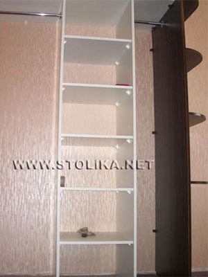 Шкаф-купе с широким зеркалом имеет классическую линейную конструкцию. Отличительная особенность представленной модели – наличие боковых радиусных полок.