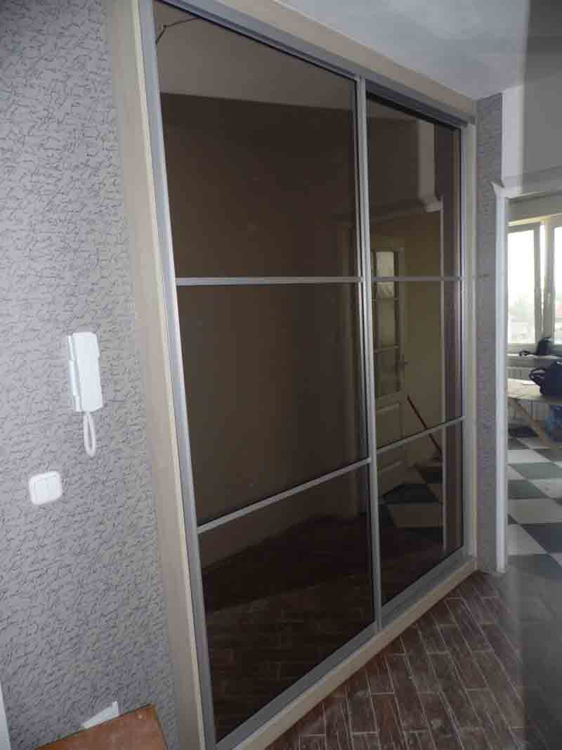 Линейный шкаф-купе предназначен для встраивания в нишу стены. Каркас конструкции изготовлен из экологически чистой и надежной ДСП. Тонированные фасады обладают зеркальным эффектом, что позволяет зрительно расширять пространство. Две раздвижные створки выполнены в алюминиевом профиле.