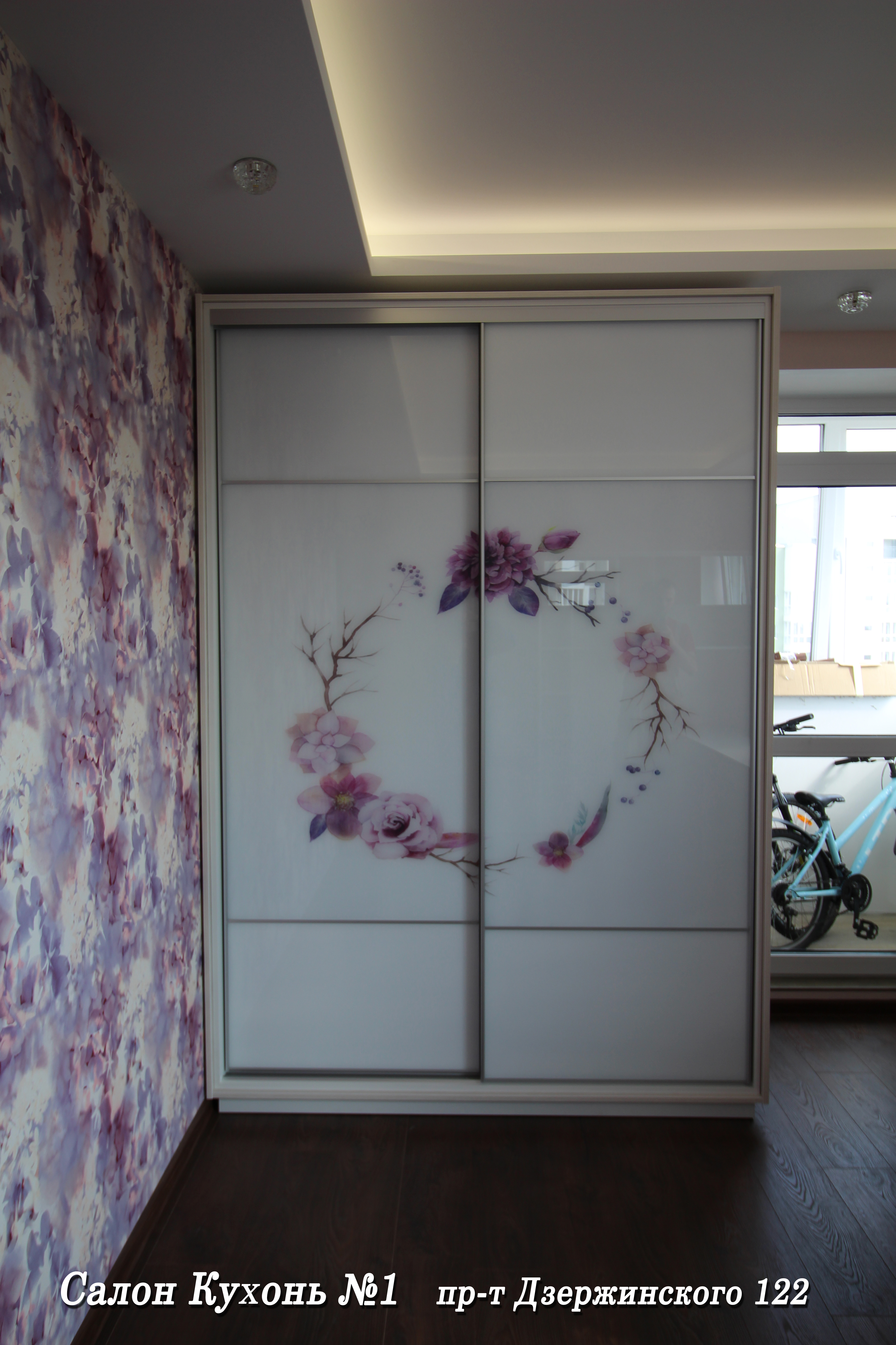Нежная и гармоничная модель линейного шкафа-купе открытого типа. Две створки в обрамлении алюминиевых профилей, декор представлен непрозрачным стеклом (лакобель), скрывающим внутреннее наполнение шкафа и оформленным рисунком в виде аккуратного венка с цветущими фиолетово-розовыми бутонами.