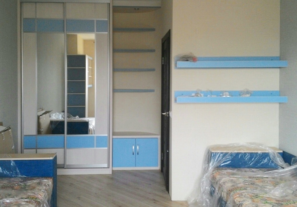 Данный набор мебели подойдет для оформления прихожей квартир и домов, а также гардеробной зоны в стандартной планировке общежитий или гостиниц. Сочетание на фасадах матовых белого и голубого с применением зеркал делает интерьер легким, аккуратным, визуально расширяет пространство. Шкаф-купе на две створки встроен в нишу, фасад разделен серебристыми перегородками, в тон профилю, на разносторонние прямоугольники с центральной зеркальной вставкой. Корпус дополняют четыре бескаркасные полки, под которыми расположена тумба на двух дверцах.