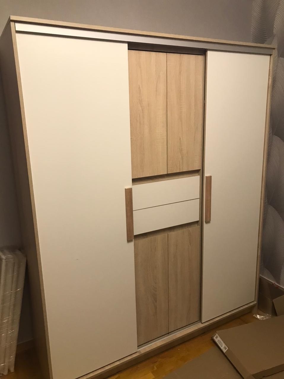 Боковые створки шкафа из ЛДСП, центральная створка с зеркальной вставкой во весь рост.