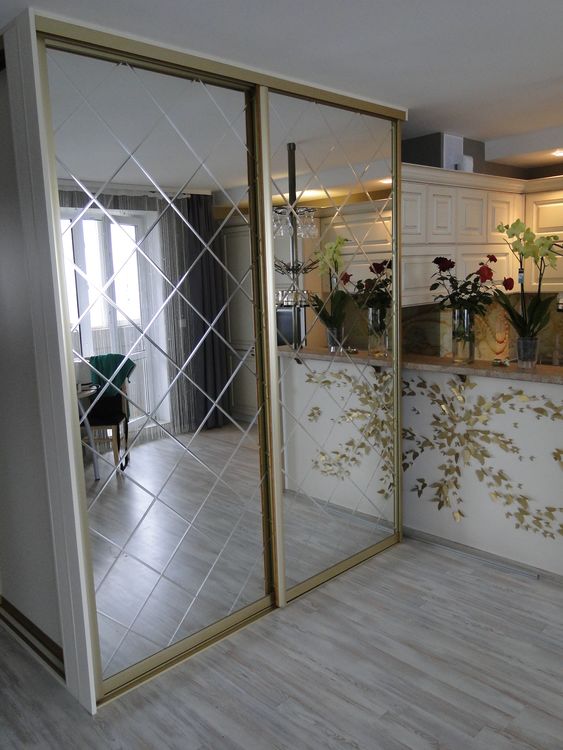 Двухстворчатый встраиваемый шкаф-купе, с профилем цвета «шампань». Зеркальные створки украшены граненым элементом – фацетом. Благодаря своей поверхности, визуально увеличивает пространство прихожей, добавляет света в помещении. Лаконичный и стильный дизайн, подчеркнутый тисненым декорирующим элементом створок.