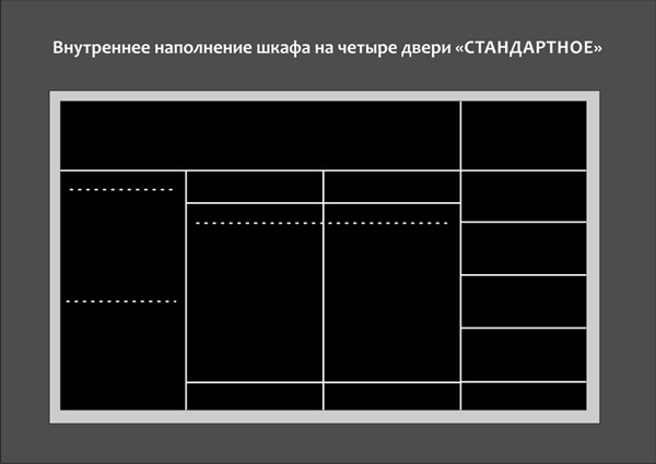 Шкаф-купе оснащен четырьмя раздвижными дверями, две из которых зеркальные и находятся посередине. Внутреннее наполнение включает в себя шуфляды, полочки, различные отделения для вещей и др.