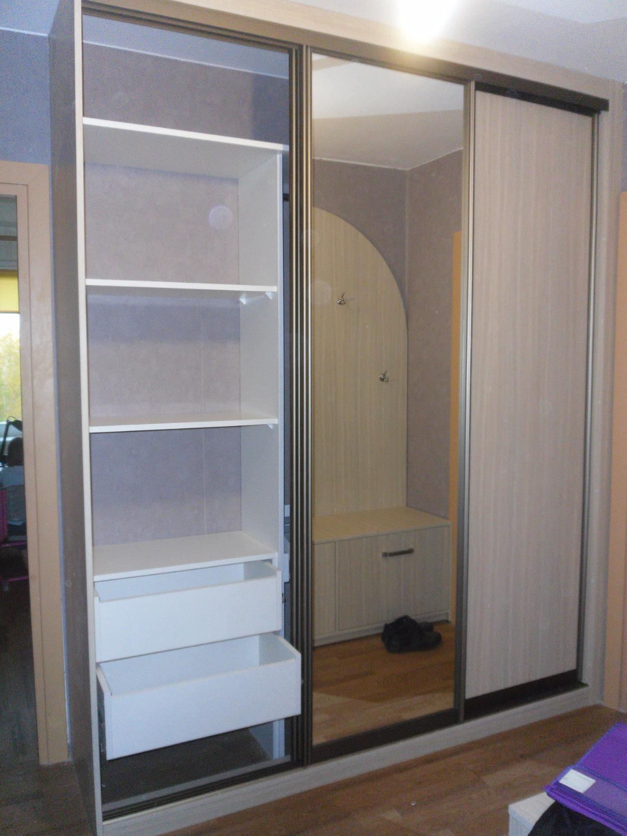 Наполнение шкафа-купе представлено в виде открытых полок и выдвижных ящиков для вещей, а также штанг для вешалок с одеждой. Центральная створка оборудована зеркалом во весь рост, Вместительные габариты позволяют модели вмещать не только одежду, но также обувь и другие вещи.