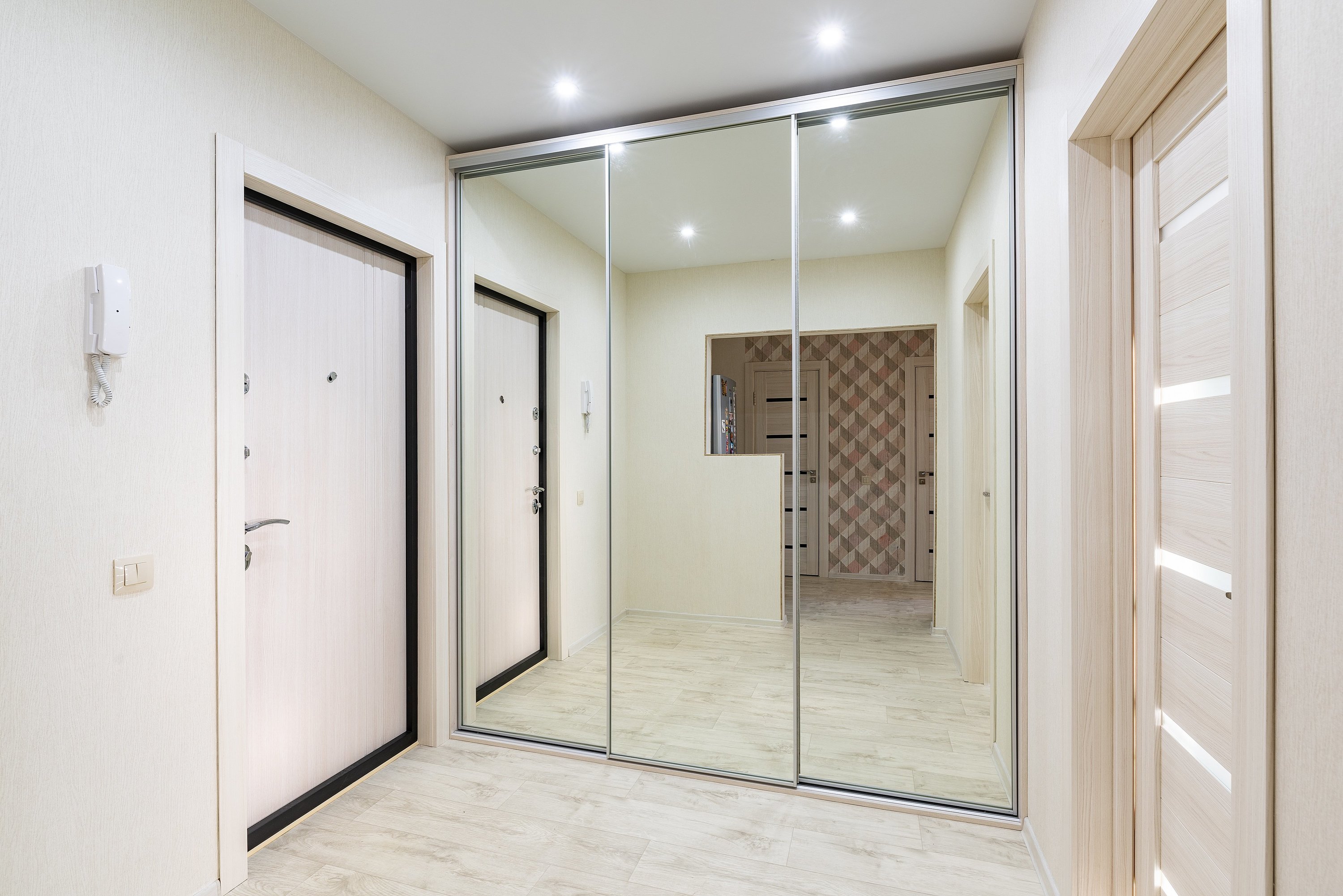 Корпусный шкаф-купе древесного оттенка с одним зеркалом. Ширина 112 см.