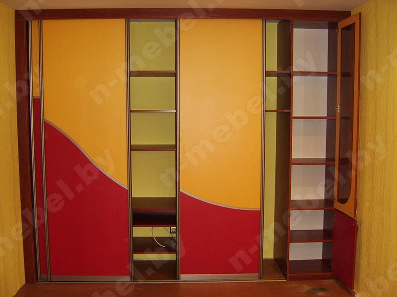 Яркий шкаф-купе станет настоящим украшением в вашем доме. Красочный желто-розовый фасад позволит модели стать главной изюминкой в интерьере спальни, детской или гостиной. Три раздвижные створки шкафа оборудованы современной системой, позволяющей им работать плавно и практически бесшумно, распашная четвертая створка оснащена стеклянными вставками и небольшими металлическими ручками.