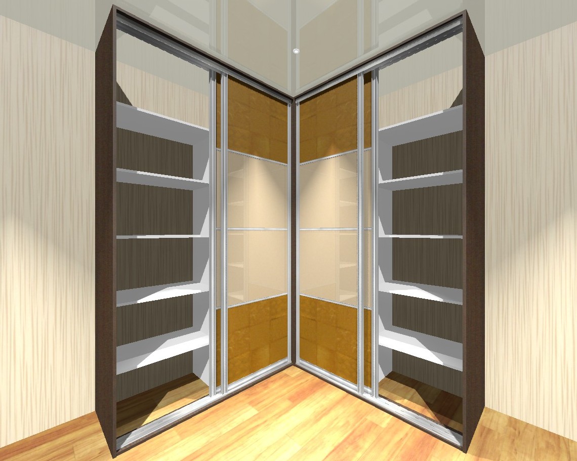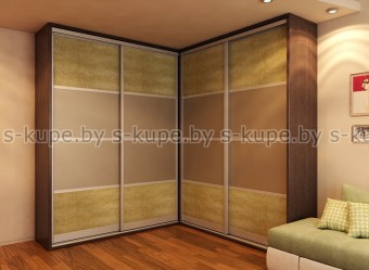 Равносторонний угловой шкаф на четыре створки. На фасаде горизонтальное сочетание древесной текстуры и глянцевого лакомата в расцветке под бронзу.