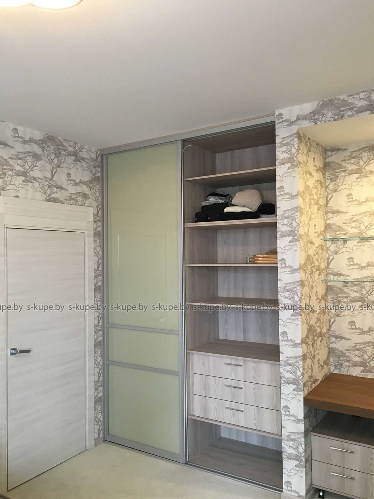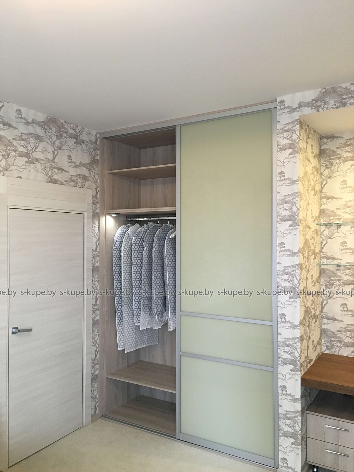 Встроенный в нишу гардероб в две створки. Профиль цвета металлик гармонирует с белым дымчатым фасадом из лакомата в прямоугольной комбинации.