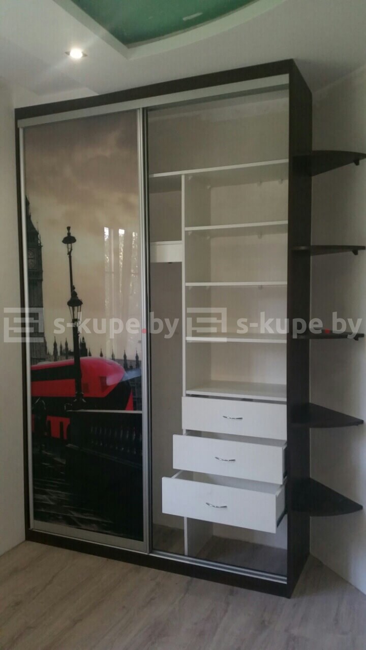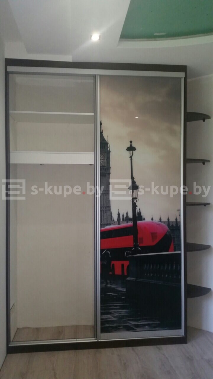 Шкаф-купе с корпусом под венге и фотопринтом на фасаде на лондонскую тематику. Зазор между стеной и торцом шкафа заполняют радиусные полки.