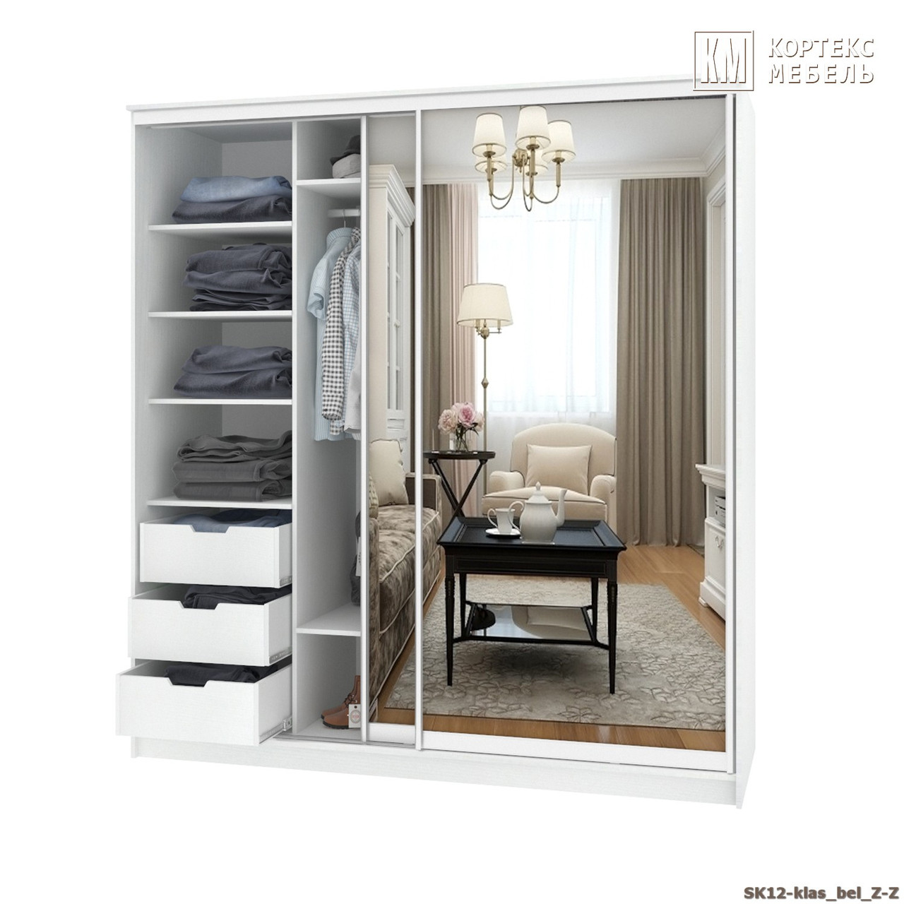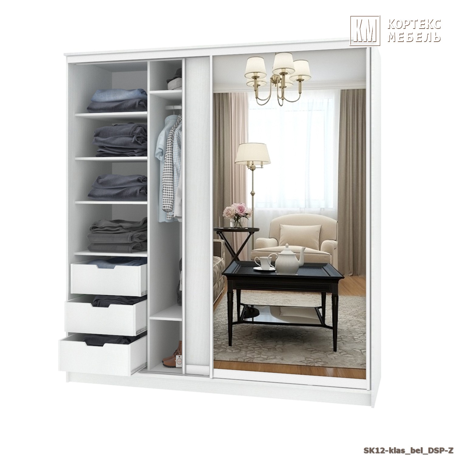Современный 2-дверный шкаф-купе шириной 205 см. производства ЧПУП «Кортекс-мебель». Стандартная глубина шкафа в 65 см. позволяет разместить одежду на плечиках без помех для открытия раздвижных дверей, а съёмные полки создают вместительные ниши для крупных вещей, таких как постельное бельё, пледы, одеяла и подушки. Встроенные выдвижные ящики станут приятным дополнением для удобного хранения полезных мелочей и небольших предметов гардероба.