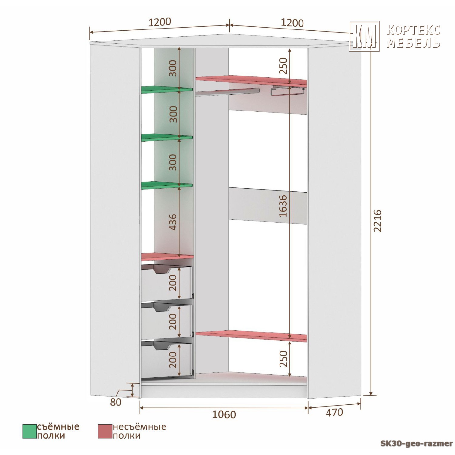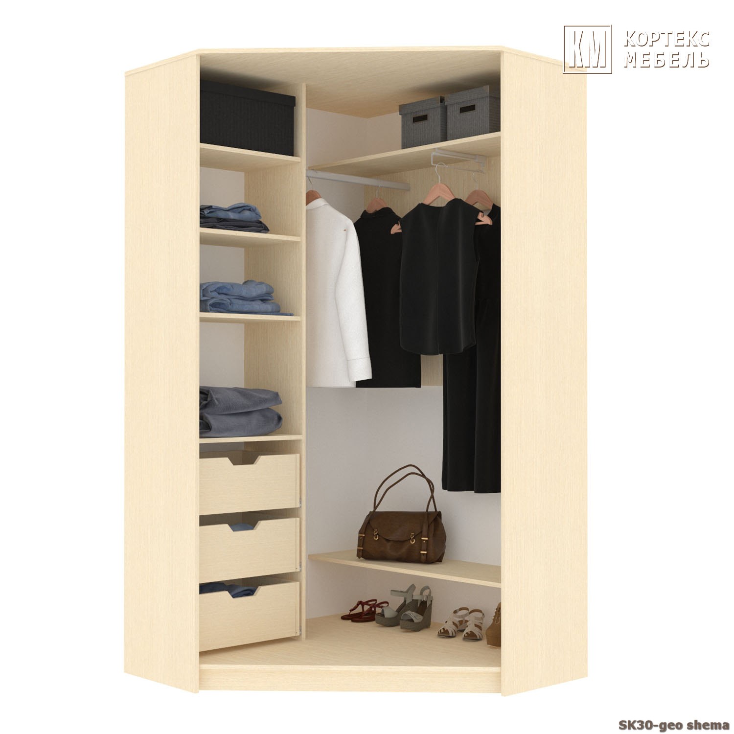 Угловой шкаф-купе СЕНАТОР ШК30 геометрия производится в нескольких цветовых решениях, в том числе и с комбинацией 2-х цветов (корпус / двери).