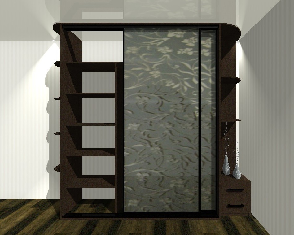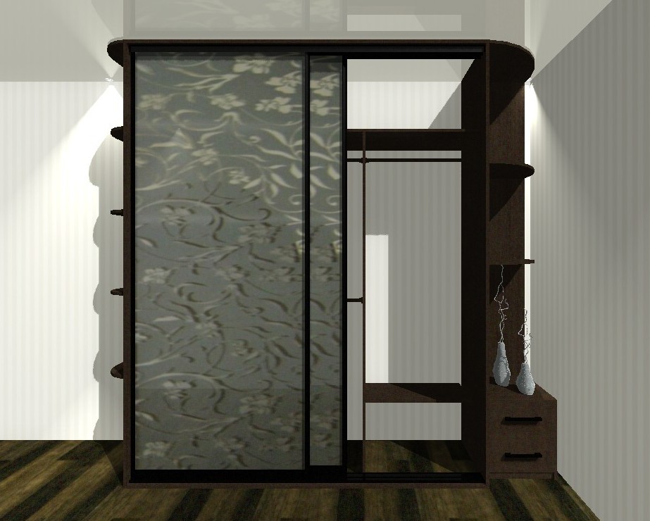 Шкаф с корпусом цвета венге и округлыми боковыми полками в торце. Темно-коричневый профиль гармонирует с общей темной расцветкой и тонированными зеркальными створками в пескоструйной обработке с растительным узором.