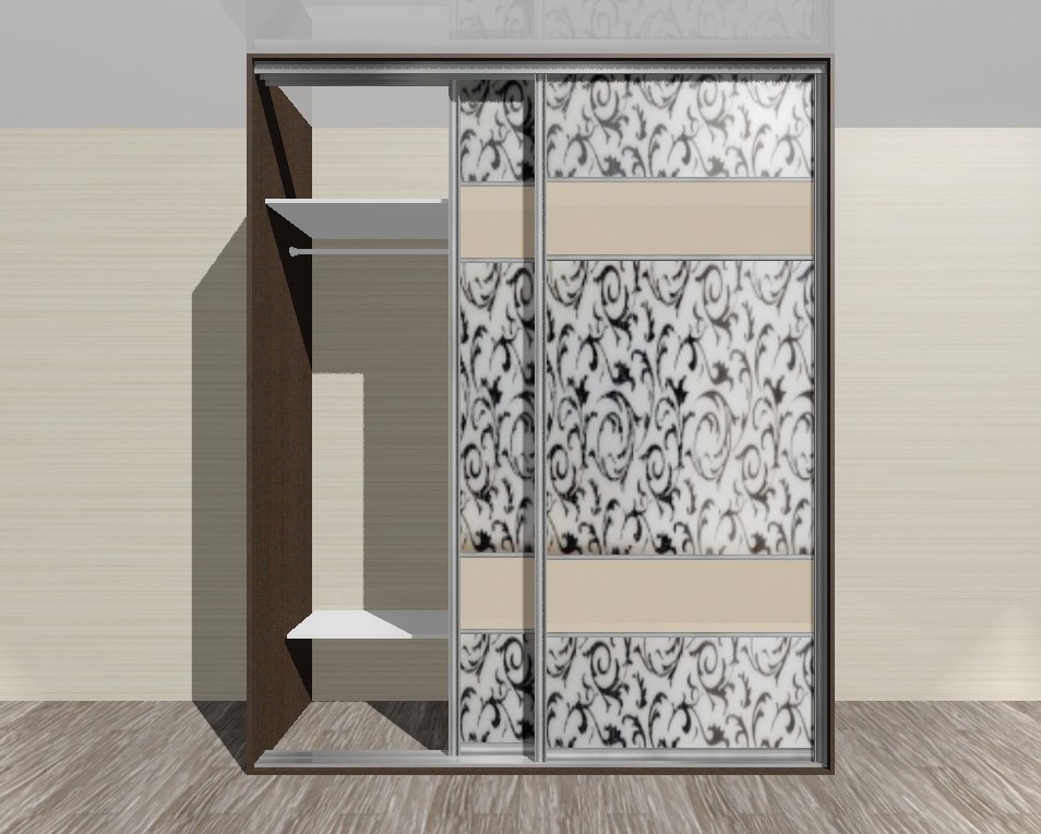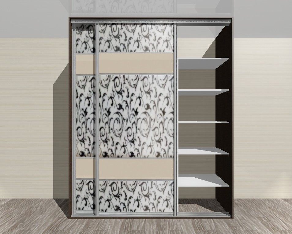 Шкаф-купе в две зеркальные створки в пескоструйной обработке и с двумя горизонтальными вставками. На дверцы нанесен узор в стиле Ампир.