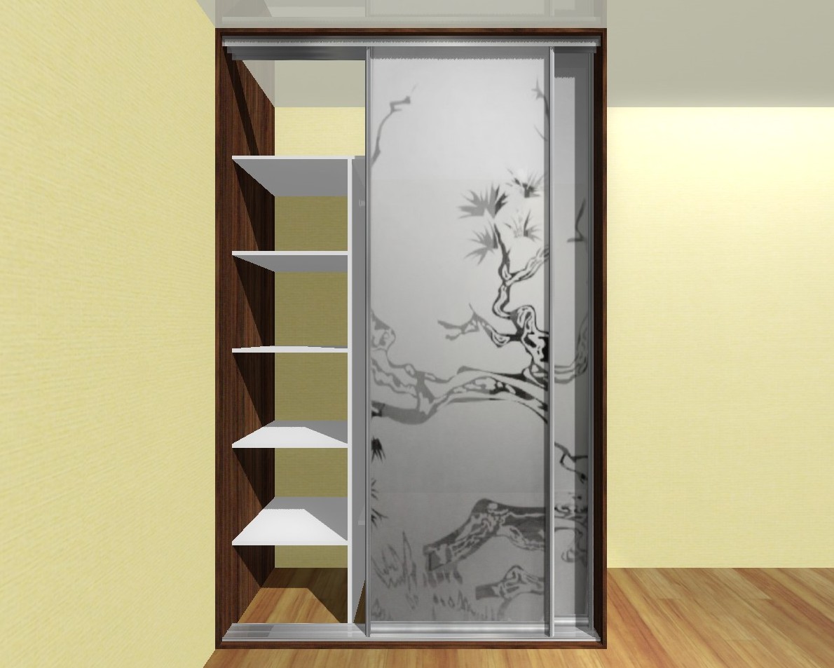 Шкаф с корпусом цвета. Фасад в две створки с пескоструйной обработкой зеркальной поверхности с изображением по мотивам китайской шелкографии.